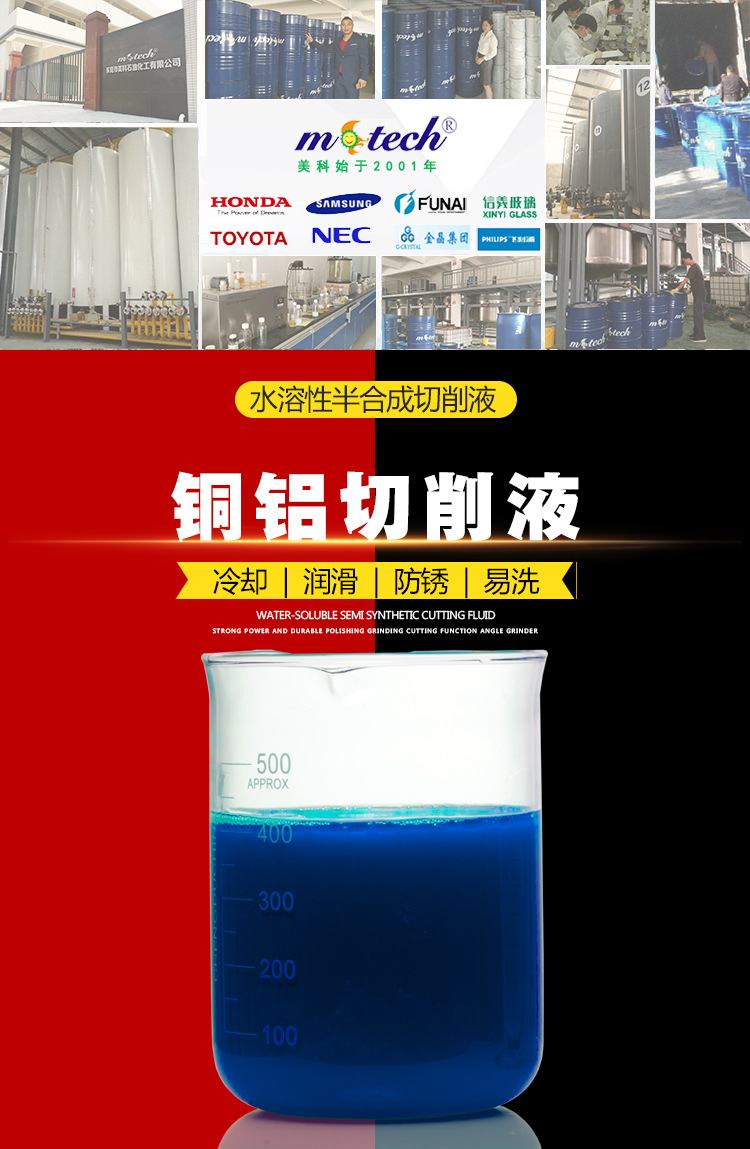 东莞美科铜铝合金切削液,具有优秀的润滑性能,防锈性能和冷却性能。废屑沉淀快,含有特效防氧化成份,可有效杜绝铜合金和铝合金工件在加工后出现白斑或发黑等氧化变色现象,适用于铝合金、铜合金、不锈钢、合金钢、铸铁、高碳钢等材料的切削、磨削、钻孔、冲压等金属加工方式。