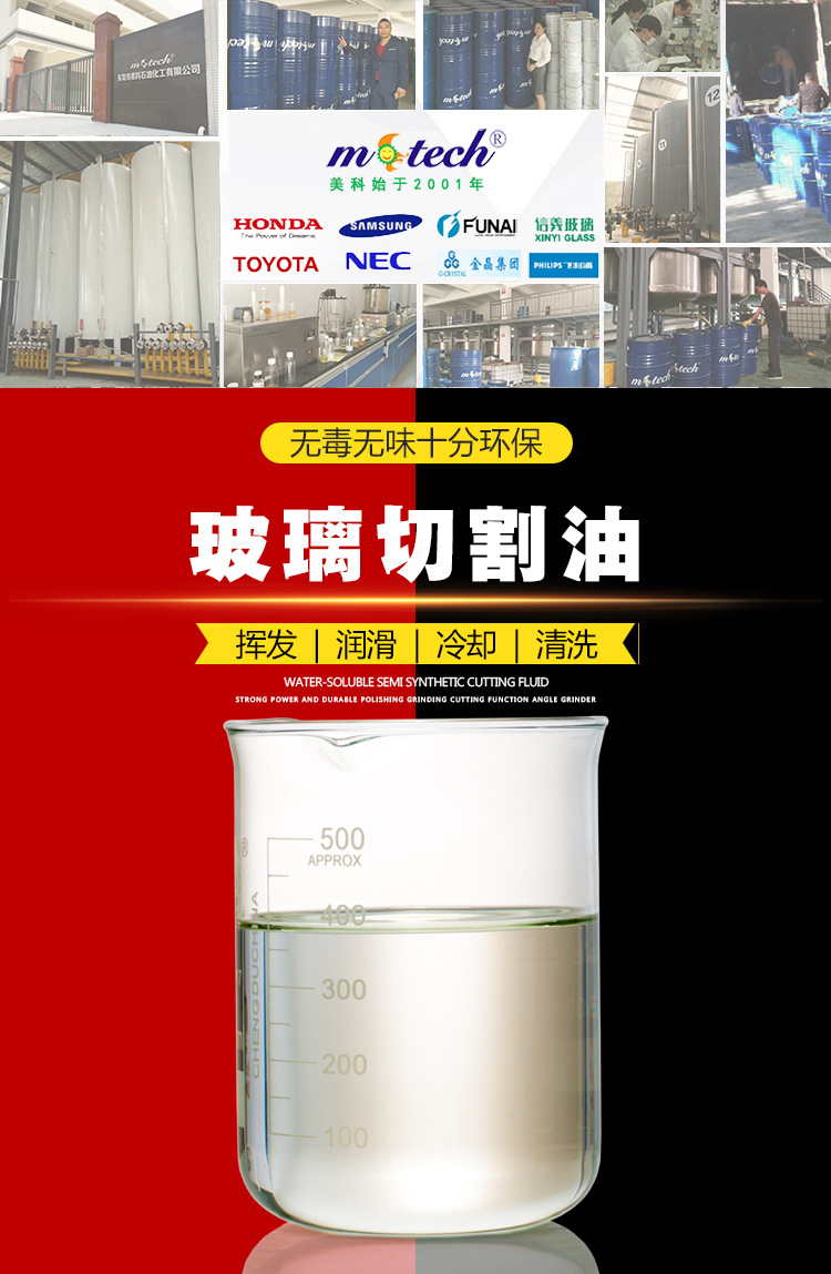 东莞美科挥发性玻璃切割油,适用于各种玻璃分块切割,具有良好的挥发性、润滑性、冷却性、和清洗性、而且无毒,无味,十分环保,不含硫、氯成份,可生物降解,不用清洗等优点。切割流畅,切割口无崩屑,掰边整齐,镀银、镀镜、釉面后无黑边现象。201A挥发较快,201挥发较慢。客户可咨询客服根据需求选择。【美科玻璃切割油全国招商火热进行中,诚邀您的加盟!全国免费咨询热线400-8898-938】