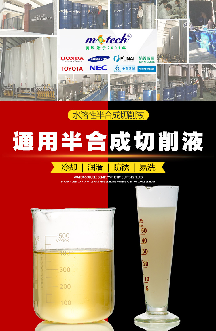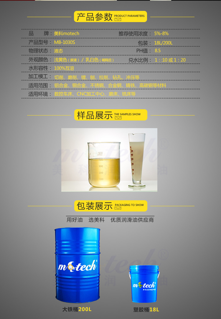 美科MB-1030S通用半合成切削液,是一款通用型高性能水溶性切削液,具有生物稳定性的新技术产品,低泡沫,具有优秀的润滑性能,防锈性能和冷却性能。废屑沉淀快,含有特效防氧化成份,可有效杜绝铜合金和铝合金工件在加工后出现白斑或发黑等氧化变色现象。尤其适用于同时加工有色金属和黑色金属的生产需求。不含亚硝酸盐、氯、锌及笨酚。